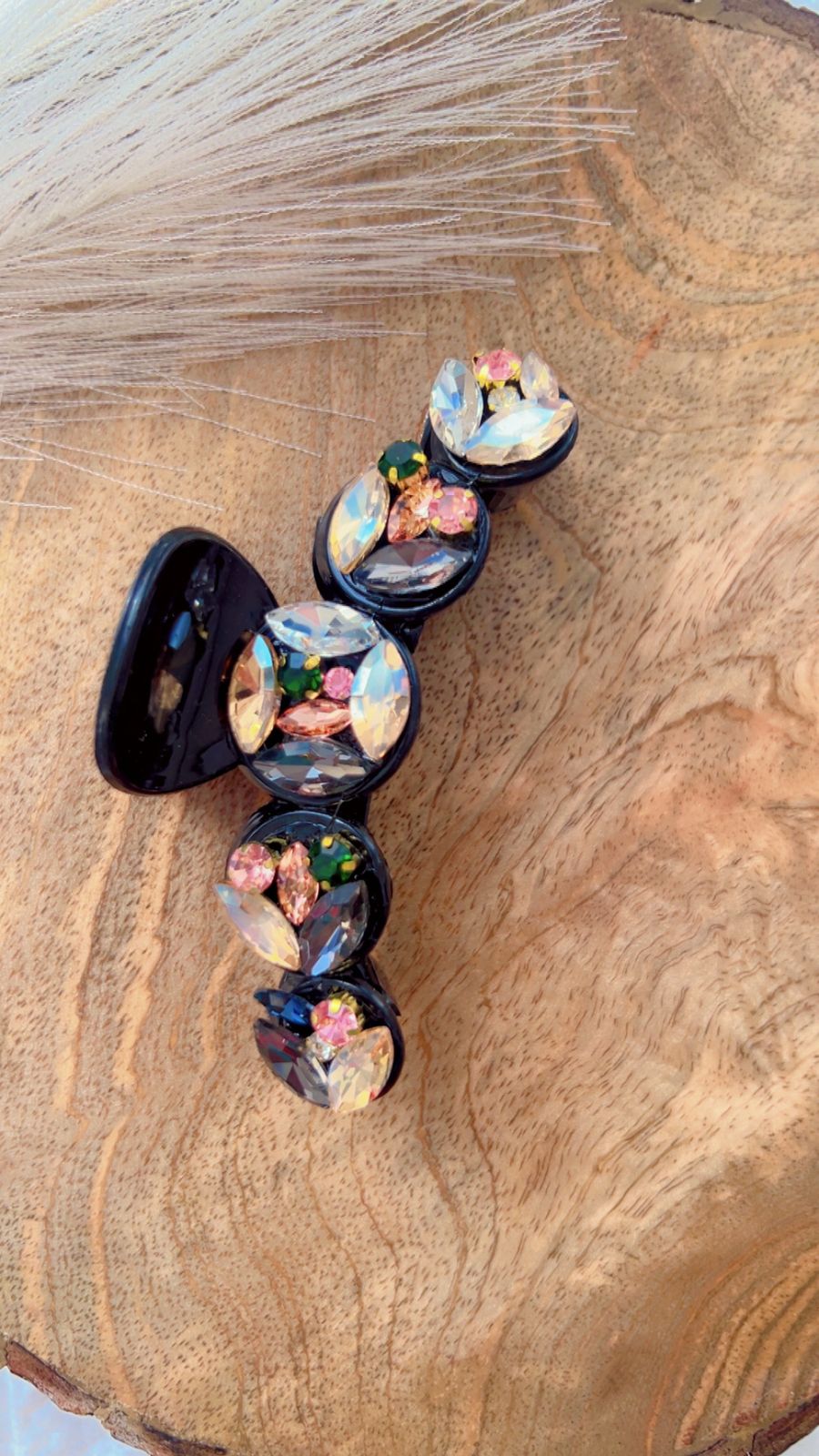 Elevate your hairstyle with this premium black claw clip, exquisitely embellished with multi-color stones for a rich, luxurious finish. Designed with both elegance and functionality in mind, this medium-sized clip offers a strong grip while making a bold fashion statement. The contrast between the sleek black base and the vibrant sparkle of carefully set stones gives it a refined, high-end appeal—perfect for adding a touch of glamour to any look, day or night.