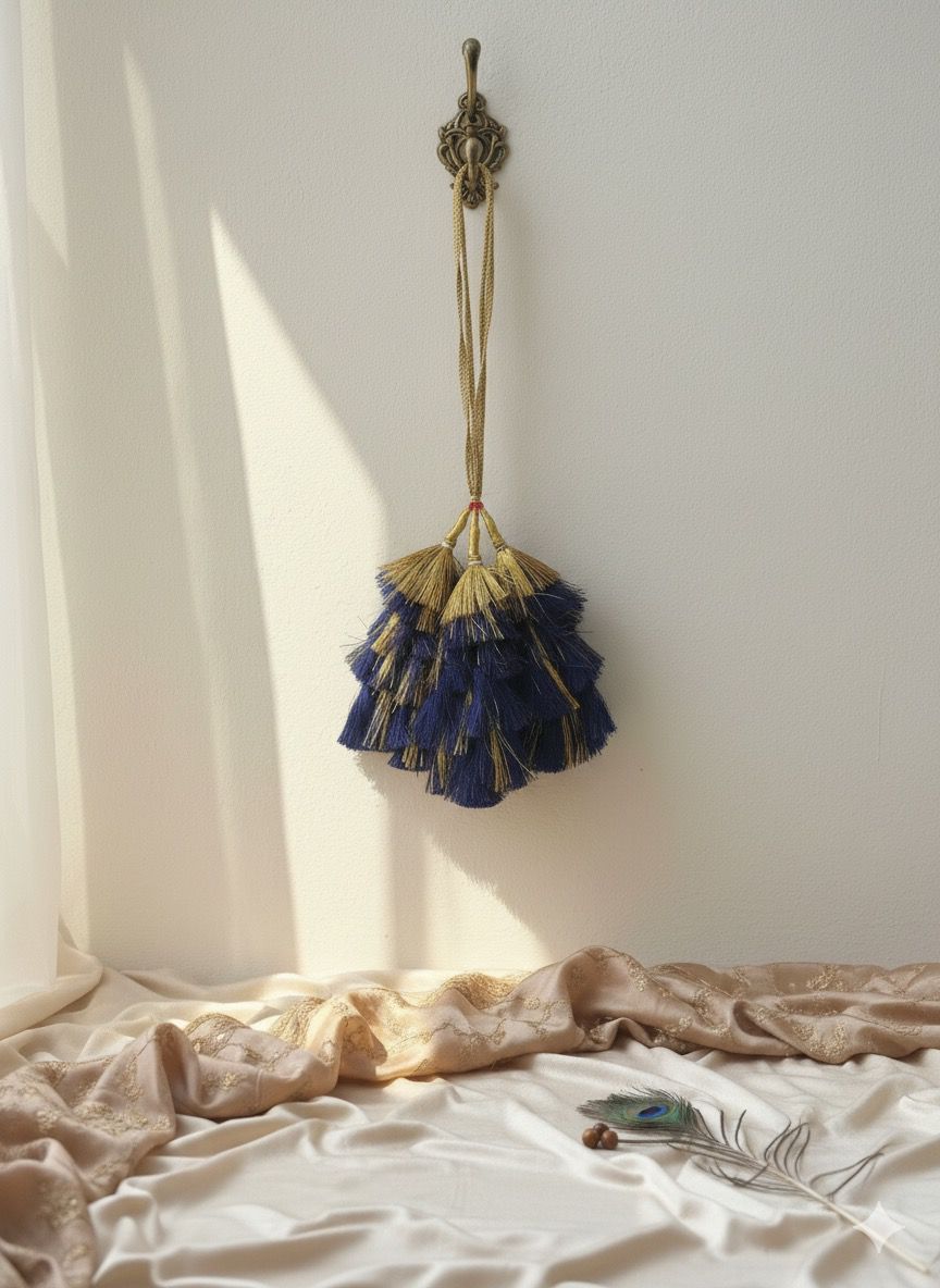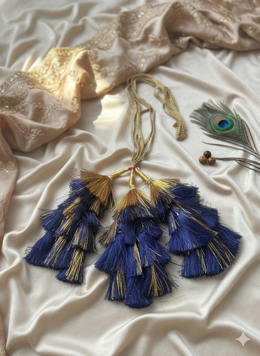 Make a royal statement with this stunning Navy Blue Parandi, featuring three heavy tassels that flow gracefully with every move. Crafted with rich threads and intricate detailing, this parandi adds an elegant touch to your traditional hairstyles. Perfect for weddings, festive occasions, or cultural celebrations, it instantly elevates your ethnic look with its deep navy hue and luxurious finish. Pair it with lehengas, suits, or sarees to complete your regal ensemble.