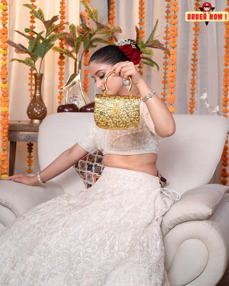 Elevate your festive and wedding look with our Brass Metal Golden Polish Bag — a timeless accessory crafted from premium-quality brass. Finished with a rich golden polish, this bag is specially treated to resist tarnishing and maintain its brilliant shine, so it never turns black. Lightweight yet durable, its intricate detailing makes it the perfect companion for weddings, receptions, and festive occasions. Pair it with traditional or contemporary outfits to add a regal touch to your ensemble.
