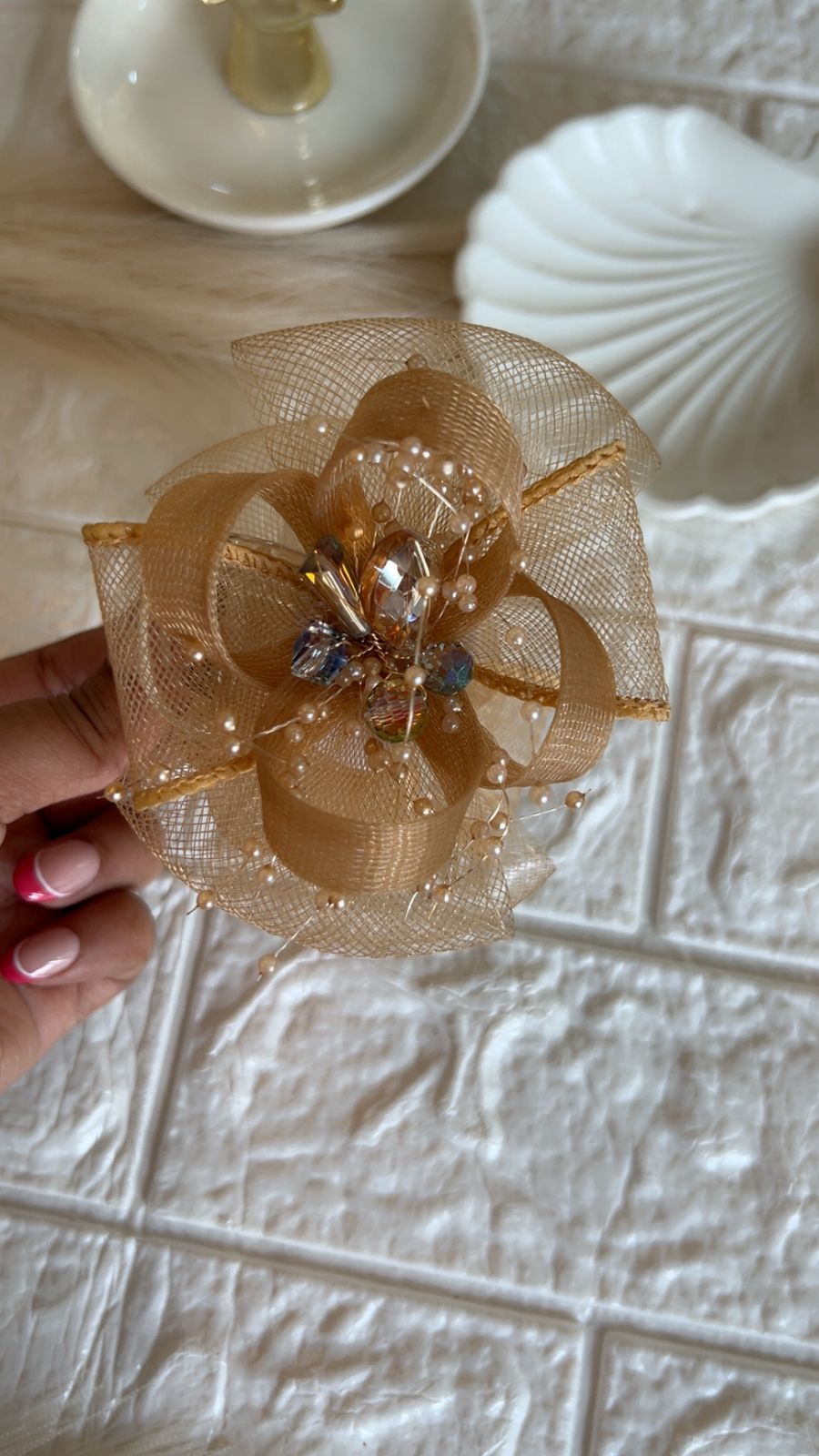 Radiating elegance and opulence, this golden bow is the epitome of premium luxury. Crafted with high-quality net fabric and encrusted with shimmering crystals, it exudes a refined glow that instantly elevates any hairstyle. The delicate net adds a soft, graceful texture, while the rich golden tone and sparkling embellishments create a regal statement