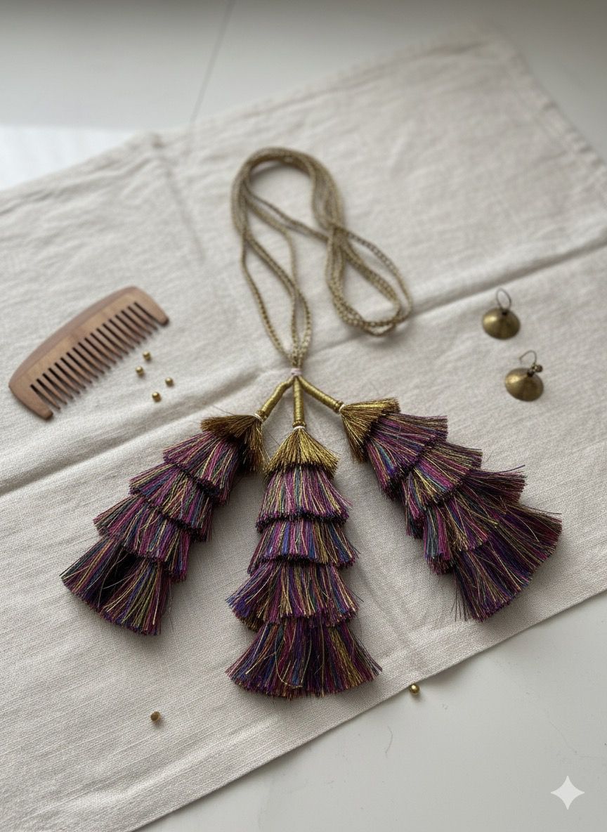 Add a regal touch to your bridal look with our Royal Tassel Parandi. This exquisite hair accessory features three grand latkans, each adorned with vibrant multicolour tassels that flow beautifully with every movement. Crafted with attention to traditional detail and modern elegance, this parandi enhances your braid with a festive charm — perfect for brides who wish to embrace culture with a statement of grace and royalty. The bold tassels make it a standout piece, ideal for weddings, mehendi, or sangeet celebrations.