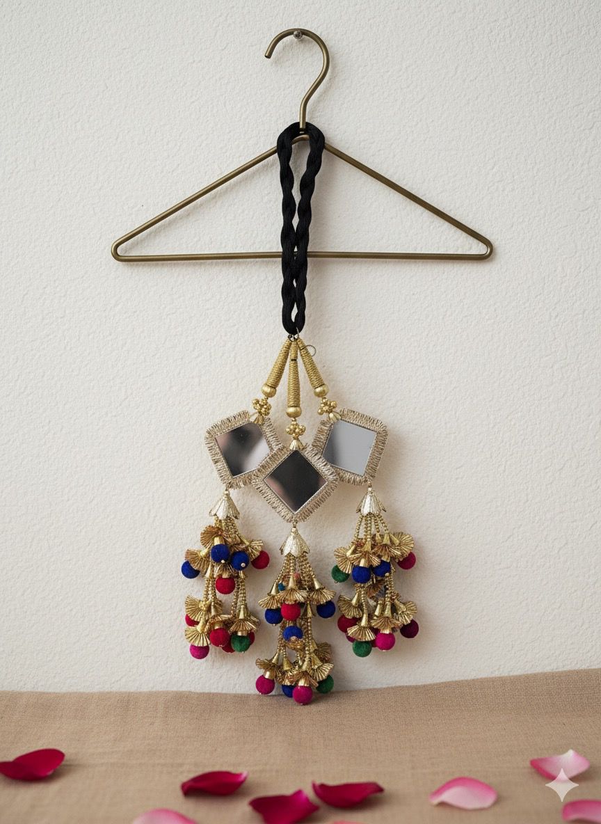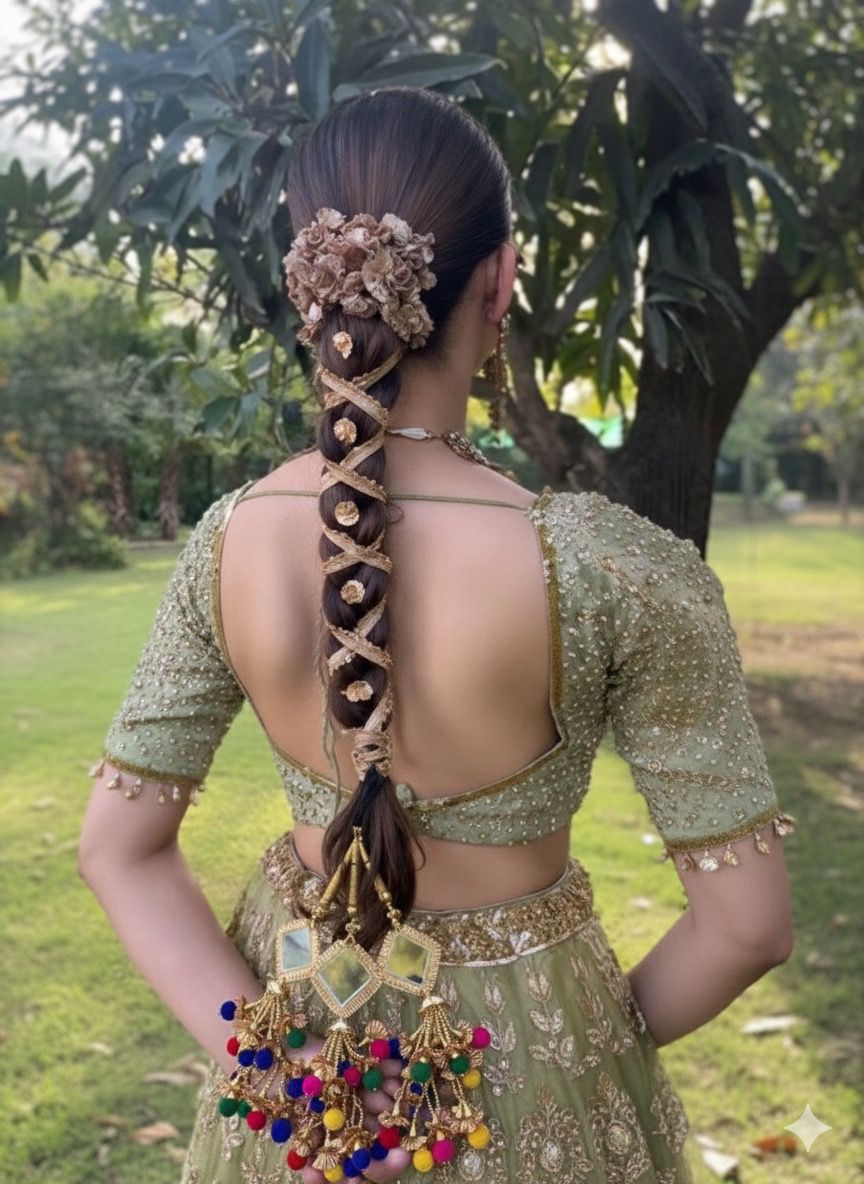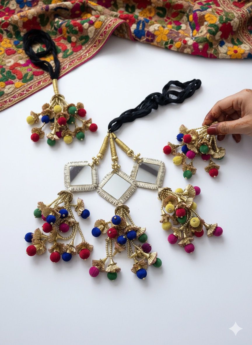 Add a regal touch to your bridal look with this stunning three-latkan Parandi, beautifully handcrafted to perfection. Each latkan features two large diamond-shaped mirrors that catch every glimmer of light, creating a mesmerizing sparkle with every move. Adorned with multicoloured round charms and intricate gota work, this Parandi celebrates traditional elegance with a modern twist. Perfect for brides who want to make a statement, it blends vibrant hues, shimmer, and cultural craftsmanship—making it an unforgettable addition to your wedding hair ensemble.