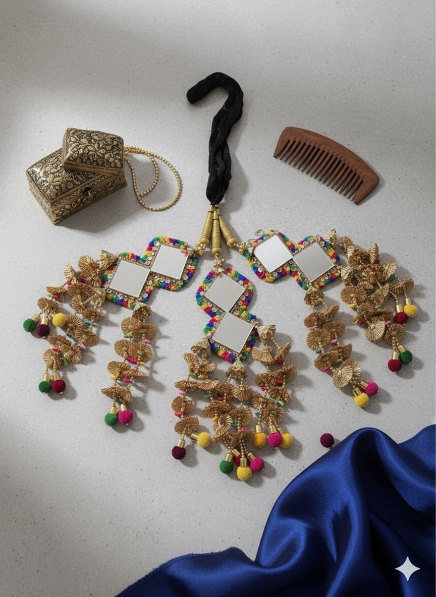 Add a royal touch to your braid with our Noor-e-Naaz Parandi, a true blend of tradition and elegance. This stunning piece features three beautifully crafted latkans, each adorned with dual-layer diamond-shaped mirrors that catch every glimmer of light. The multicolour thread and stone work bring a vibrant, festive charm—perfect for weddings, haldi, mehendi, or any cultural celebration. Designed to make your hairstyle stand out, this parandi effortlessly enhances your ethnic look with a touch of modern sparkle.