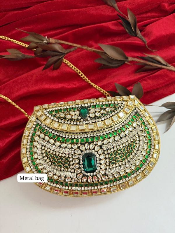 Add a regal sparkle to your festive look with our Nooré Élan Metal Bag, a stunning piece studded with shimmering rhinestones, kundans, and silver-golden-green accents. This bag beautifully blends royal charm with modern flair, making it a perfect match for sarees, lehengas, or evening gowns. The intricate stonework glimmers from every angle, while the metallic finish and sleek sling chain offer both style and convenience. A true statement accessory that turns every occasion into a celebration of elegance.