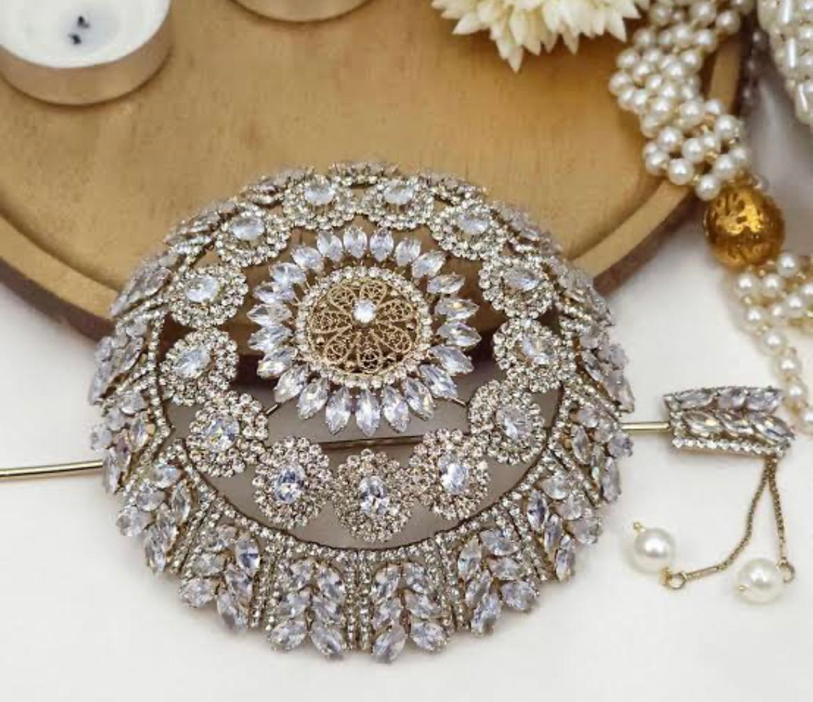 Turn every head at the wedding with our Royal Radiance Bun Cage — a stunning hair accessory that brings elegance, tradition, and sparkle together. This completely studded bun cage is designed to wrap around your bridal bun like a crown, making you look nothing less than regal. Handcrafted with shimmering stones, it catches the light beautifully, adding a royal touch to your hairstyle. Whether you're the bride or part of the bridal party, this piece is perfect for elevating your look to pure glamour. Ideal for weddings, receptions, or grand celebrations.